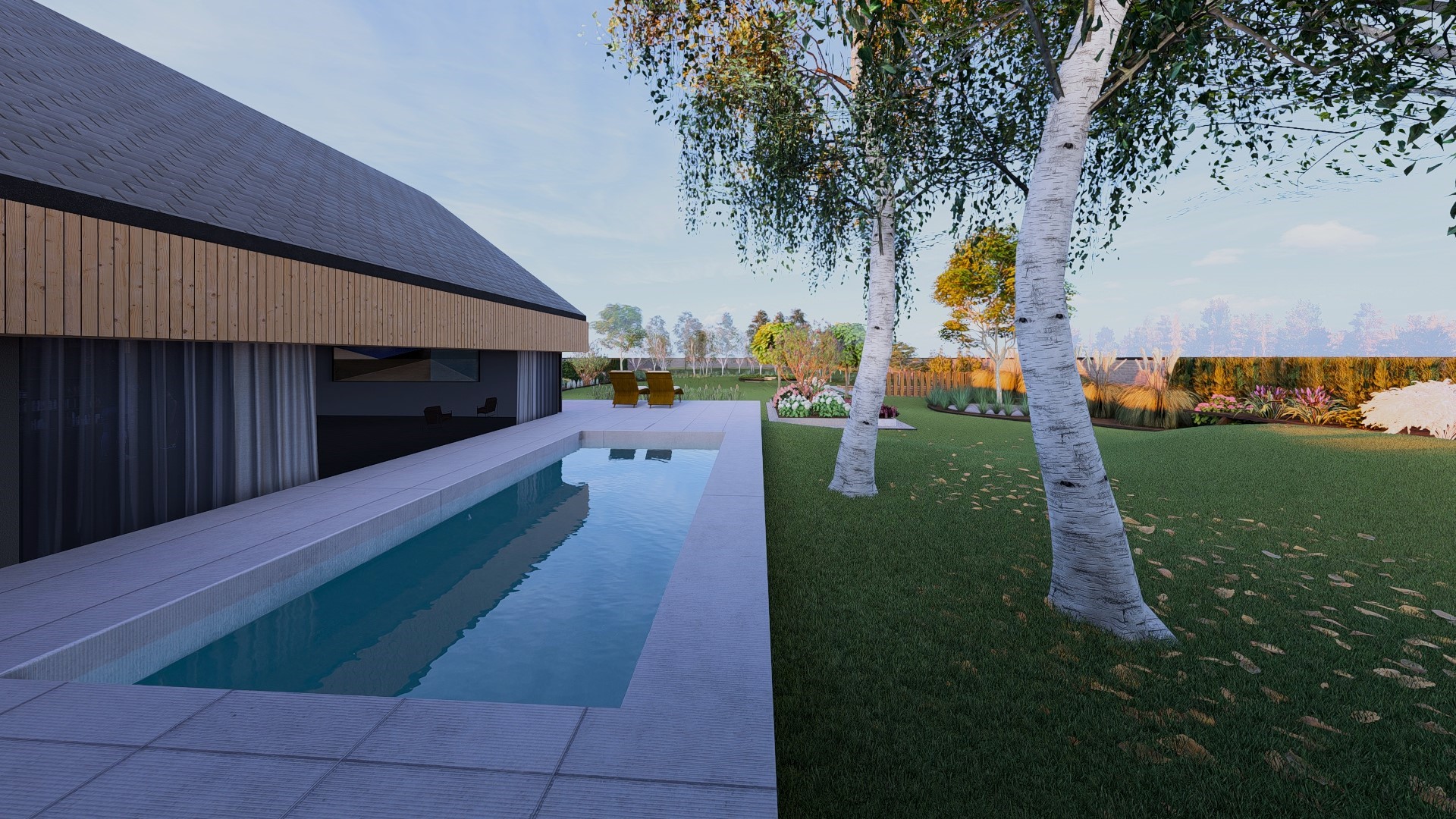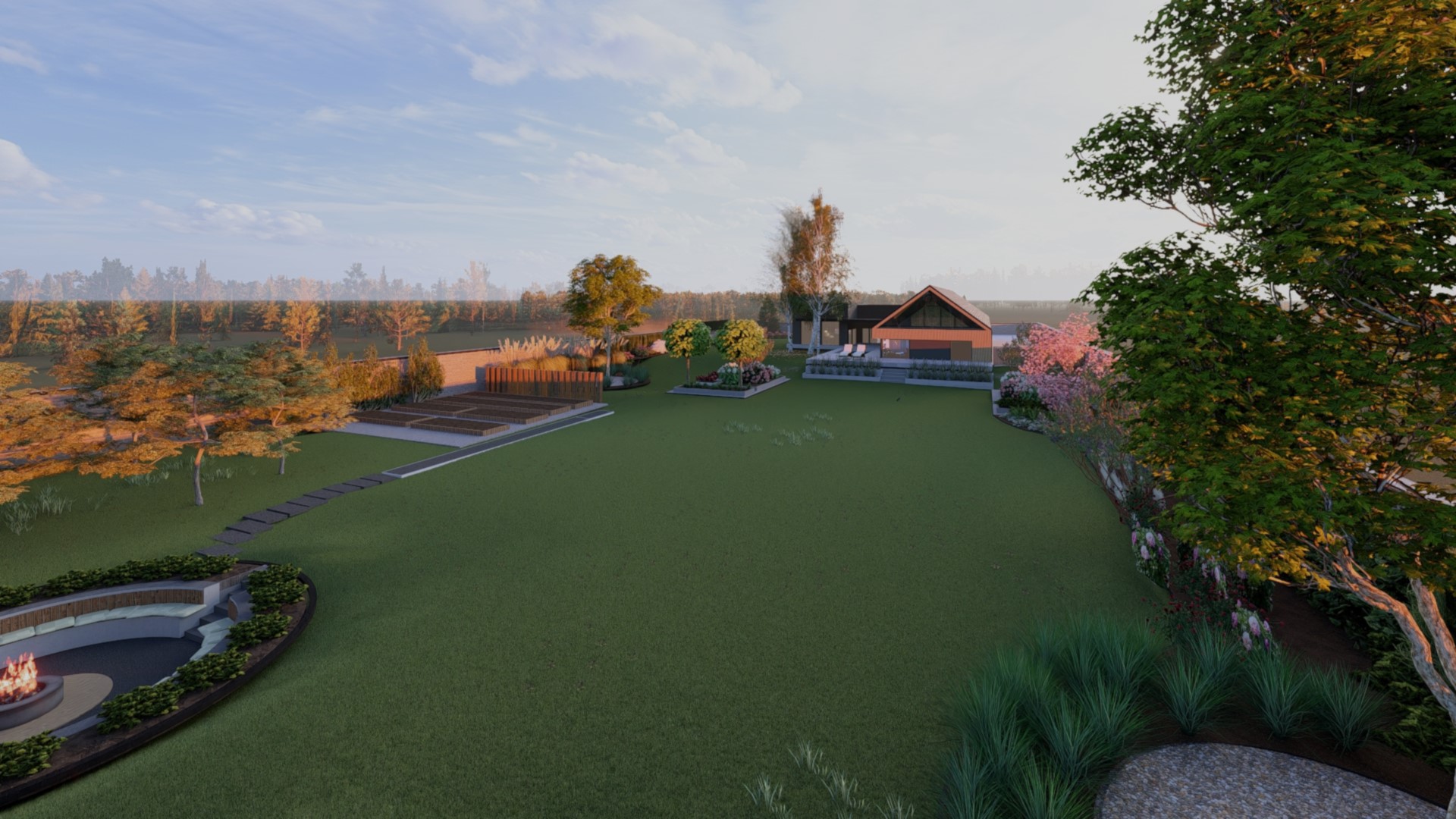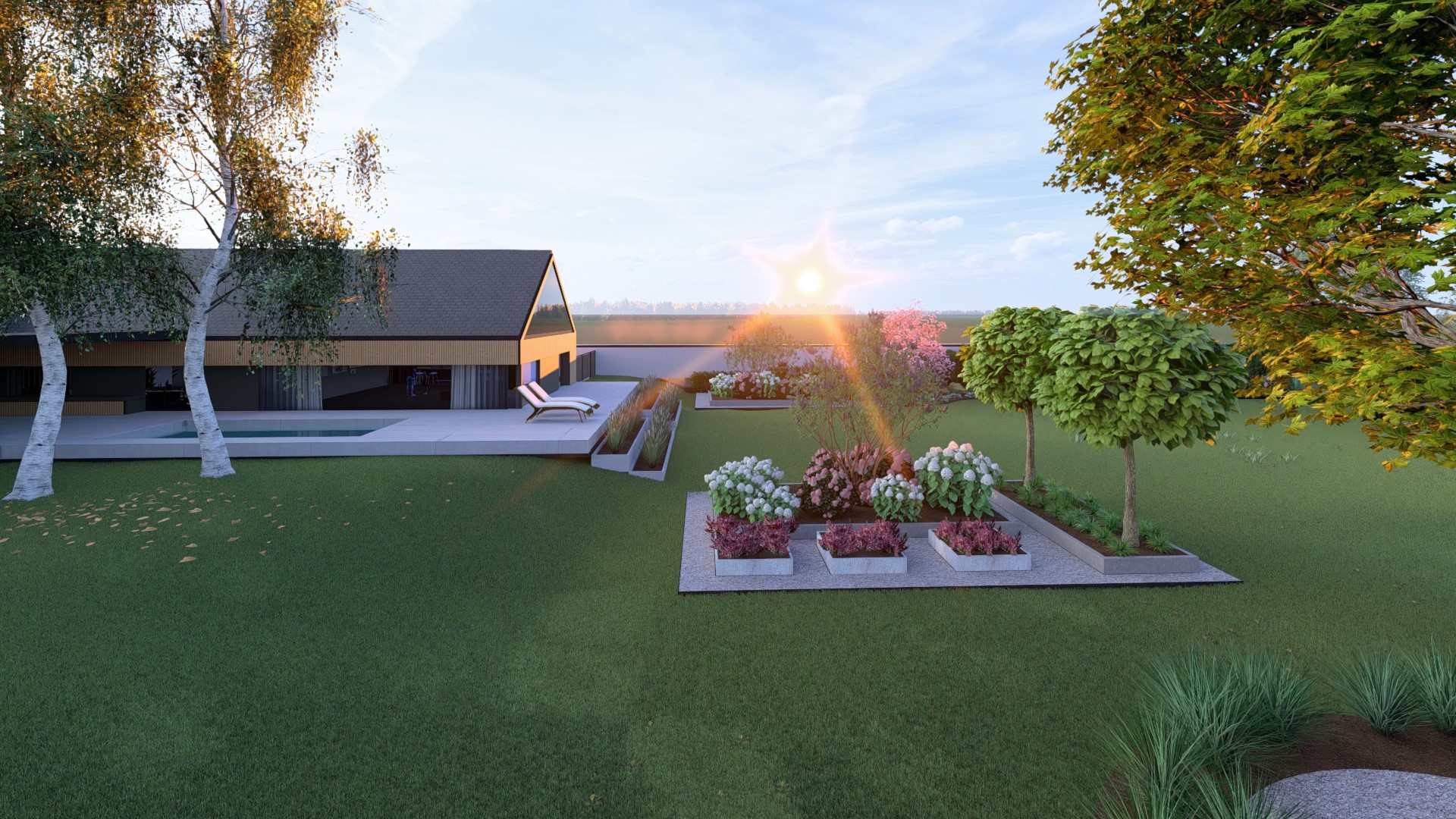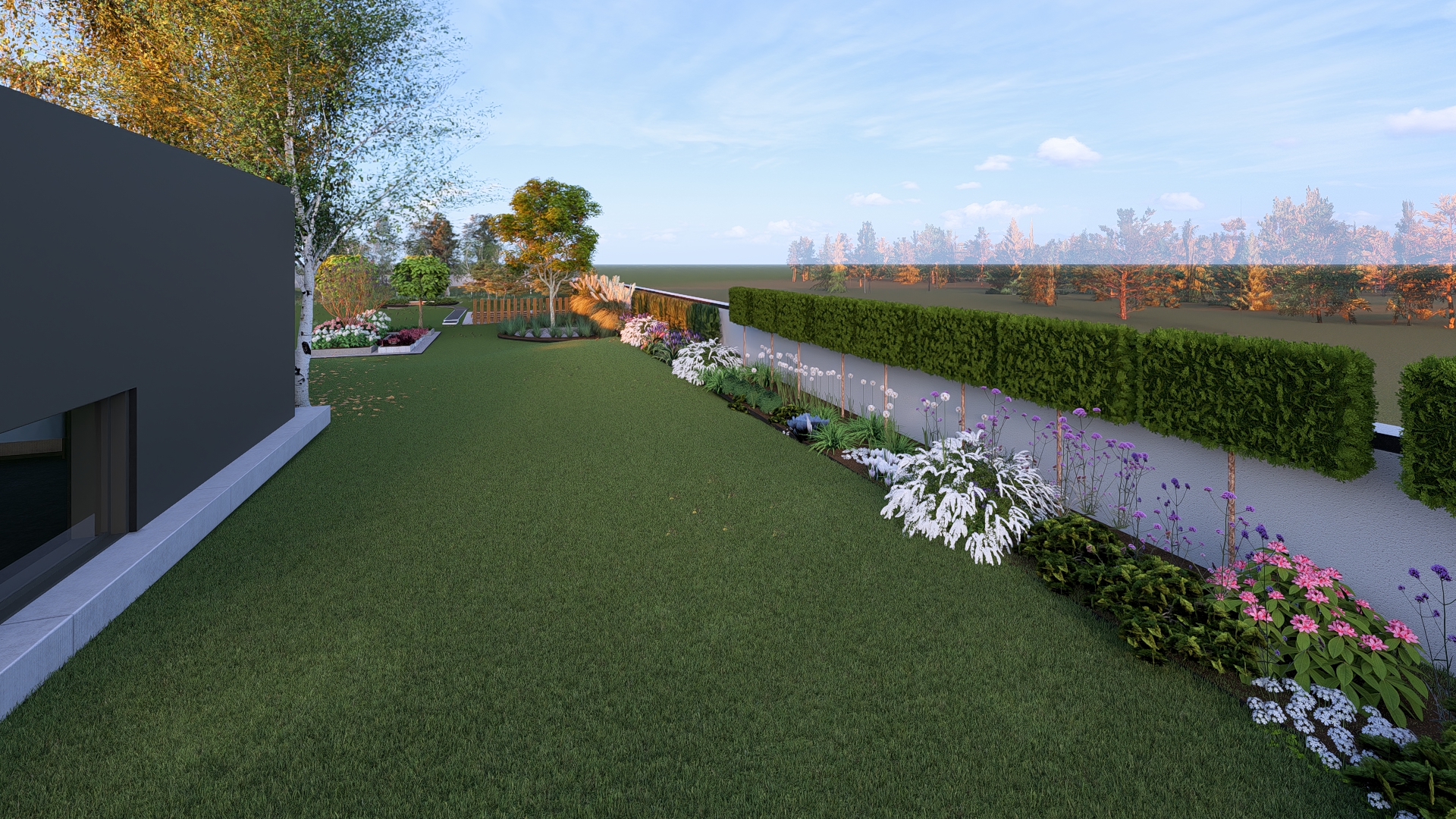 INSTA4Xx INSTAR 1 2 3 4 5 Ogród w Modlnicy Ogród przy nowo powstałym nowoczesnym domu-stodoła. Lokalizacja Modlnica, małopolskie, PolskaPowierzchnia 4000 m²Termin realizacji lato 2023Założenia - ogród w kolorach biało-różowym - rośliny: hortensje, lilaki, wrzosy - betonowe donice - wybieg dla psów - palenisko - las sosnowo-brzozowy - miejsce na warzywniak - dużo trawnika