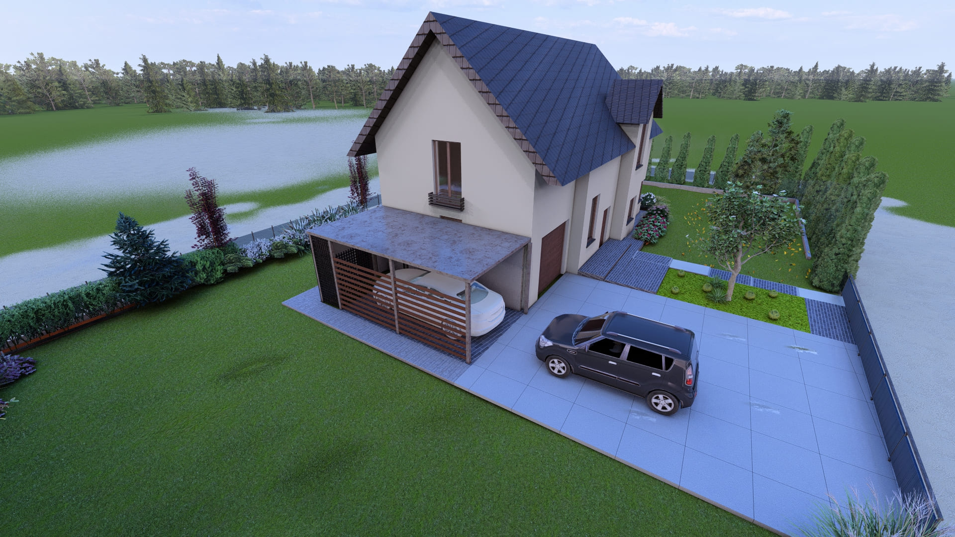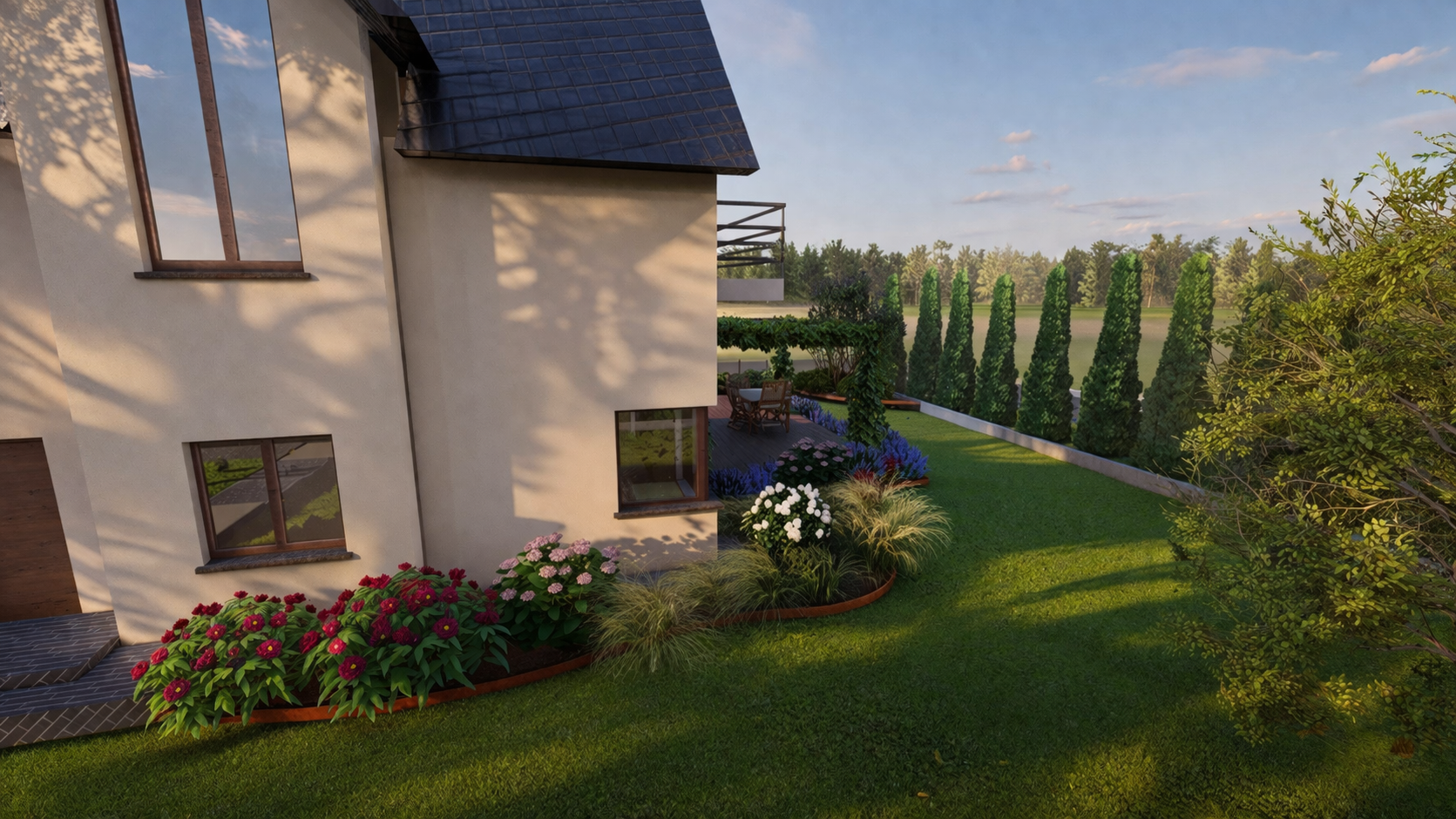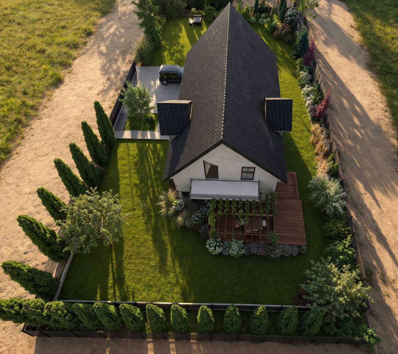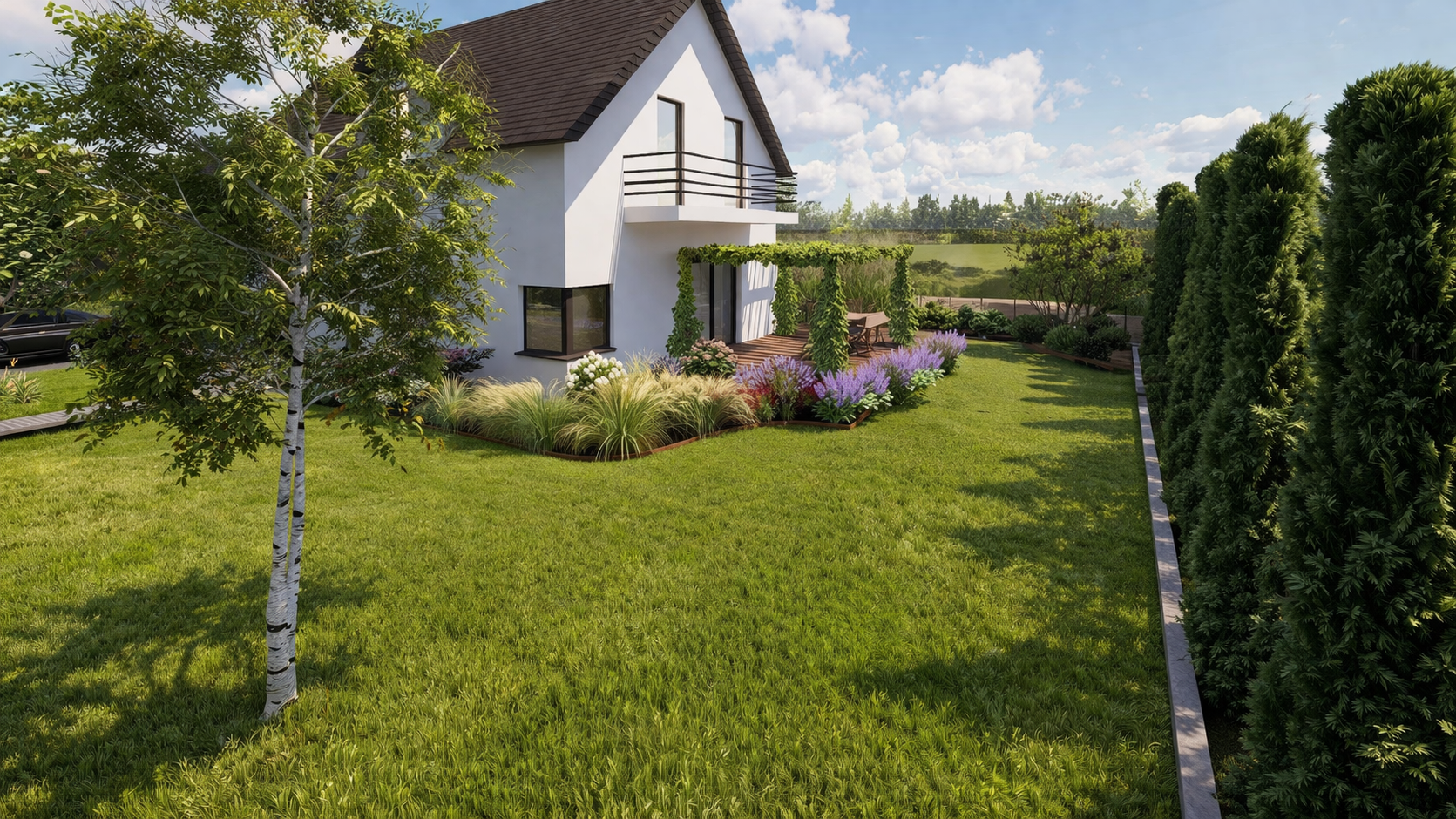 This light, minimalist garden from 2024 is dominated by majestic ornamental grasses—stunning miscanthus—which bring a sensual dynamism and soothing rustle to the surroundings, while keeping maintenance to an absolute minimum. An integral part of the composition is a stylish, custom-designed carport with a wood shed, which perfectly combines high functionality with natural aesthetics. It is the ideal project for clients who value their time, timeless design, and striking greenery that sways in the breeze.