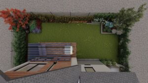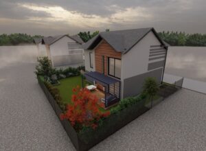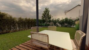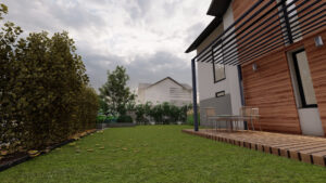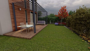 Głównym założeniem tej realizacji, zaplanowanej na wiosnę 2025 roku, jest mistrzowskie połączenie zadbanego trawnika z niezwykle bujną, wielopoziomową roślinnością i wyselekcjonowanymi drzewami, które gwarantują prywatność. Dopełnieniem tej zielonej enklawy jest eleganckie zadaszenie tarasu, które zamienia ogród w całoroczny, przytulny salon na świeżym powietrzu, idealnie powiększając przestrzeń życiową domu.