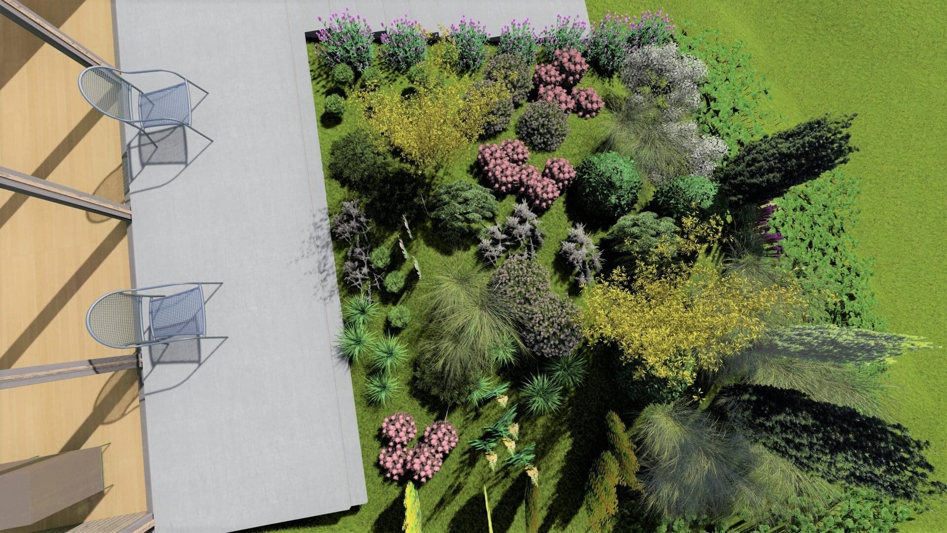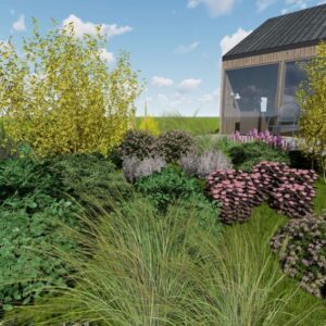 Na kameralnej przestrzeni 180 m² wykreowano swobodne, naturalistyczne założenie, które stanowi idealne, miękkie dopełnienie surowej i niezwykle modnej bryły domu w stylu 'nowoczesnej stodoły’. Kluczowym sukcesem tej realizacji było mistrzowskie zagospodarowanie wymagającej skarpy. Dzięki zaprojektowaniu kaskadowych, dzikich rabat, inwestorzy zyskali nie tylko zachwycającą kompozycję roślinną, ale przede wszystkim bezcenną gwarancję intymności, elegancko odgradzając swoją oazę od niżej położonych posesji. To przestrzeń, w której nowoczesny design bezbłędnie przenika się z nieskrępowaną wolnością natury.