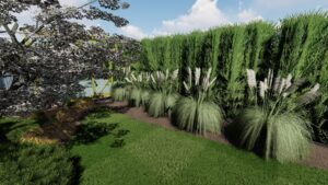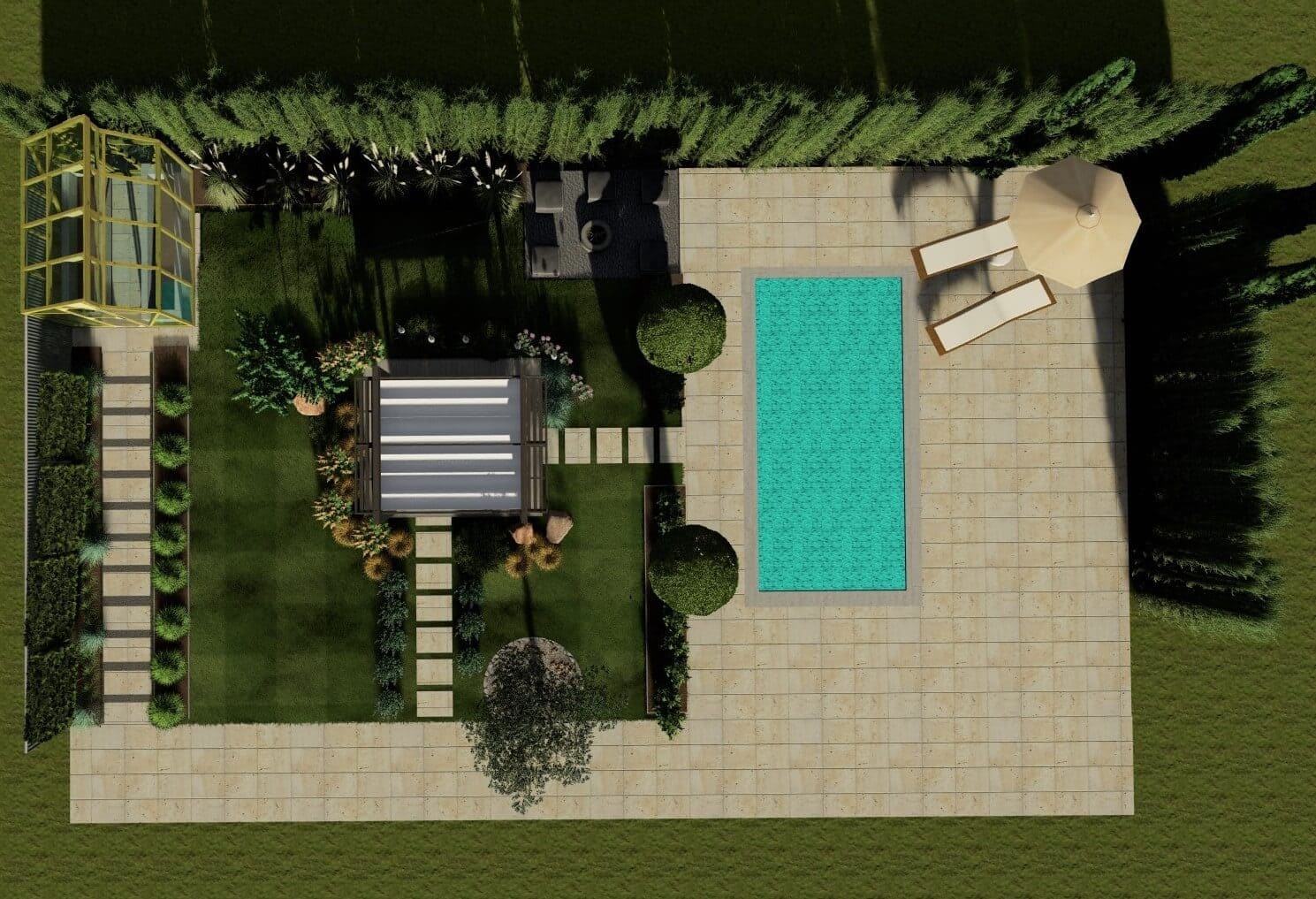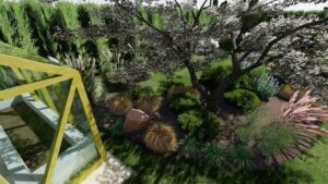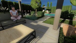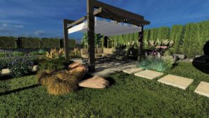 Na kameralnej przestrzeni 215 m², w bezpośrednim sąsiedztwie zabudowy bliźniaczej, wykreowano słoneczną oazę w eleganckim stylu południowym. Sercem tej zrealizowanej latem 2022 roku koncepcji jest nastrojowe palenisko wkomponowane w luksusową strefę wypoczynkową, do której prowadzą harmonijne ścieżki komunikacyjne. Dzięki niezwykle precyzyjnemu doborowi południowej, ale w pełni przystosowanej do umiarkowanego klimatu roślinności, inwestorzy zyskali własny, całoroczny kurort tuż za progiem swojego domu.