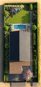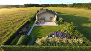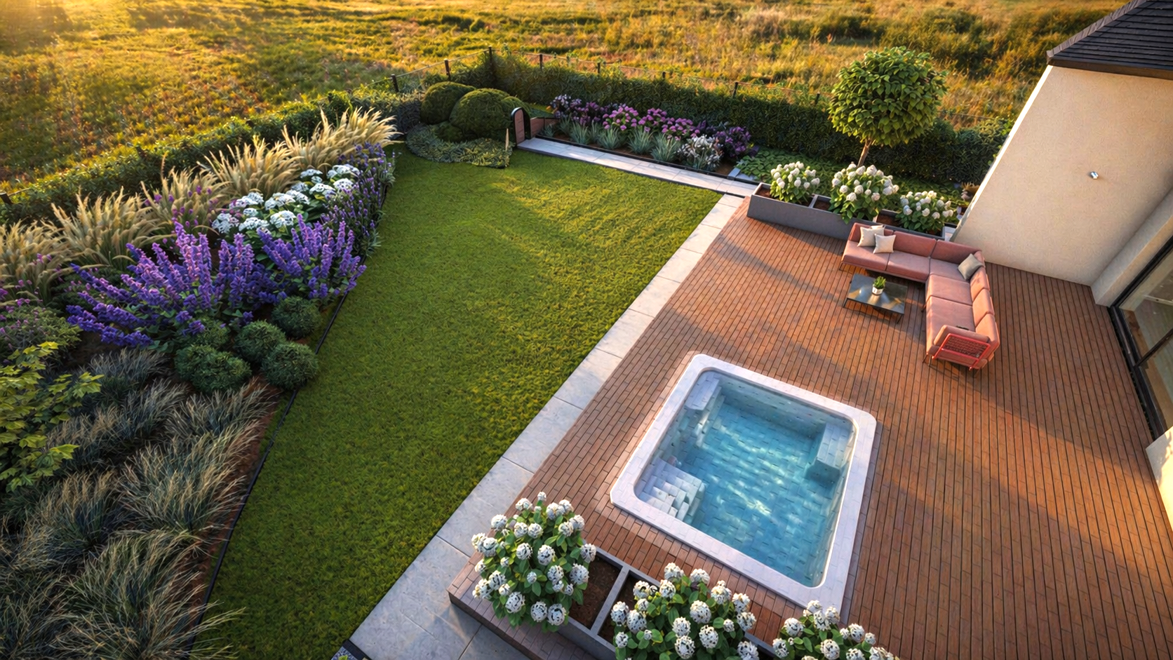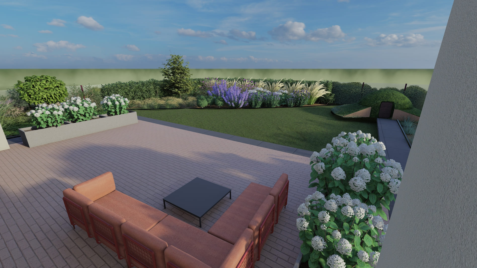 Prawdziwym sercem tej przestrzeni z 2023 roku jest innowacyjna, żelbetowa piwniczka ogrodowa, która dzięki estetycznemu przysypaniu ziemią została organicznie wkomponowana w krajobraz, tworząc urokliwe, zielone wzniesienie. Autorski projekt roślinności z wielką starannością otula tę unikalną formę architektoniczną, nadając otoczeniu tajemniczy, butikowy wręcz charakter. To doskonały przykład mistrzowskiego połączenia praktycznej przestrzeni – idealnej na prywatną winiarnię lub luksusową spiżarnię – z najwyższej klasy, naturalną estetyką.