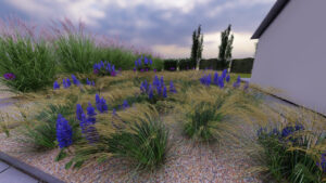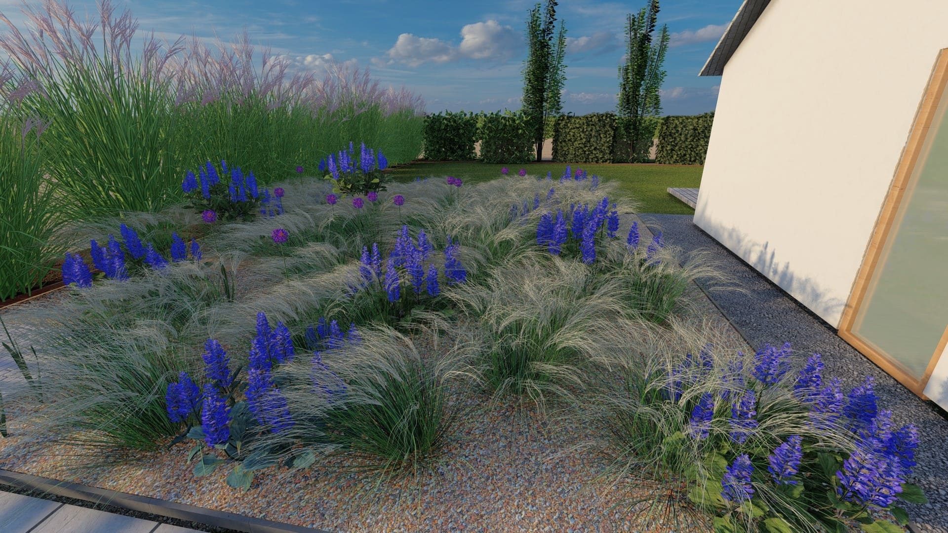 W otoczeniu kameralnego domu zaprojektowano elegancką, słoneczną rabatę żwirową, która wita gości już od strony dopracowanego w każdym detalu podjazdu, nadając frontowej części posesji niezwykle reprezentacyjny charakter. Kluczowym założeniem tej realizacji było zapewnienie domownikom pełnej dyskrecji – przemyślane układy roślinne i przestronne tarasy tworzą intymną strefę wypoczynkową, skutecznie osłaniając przestrzeń przed wzrokiem sąsiadów. To idealna, spójna i łatwa w utrzymaniu przydomowa oaza.