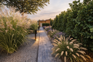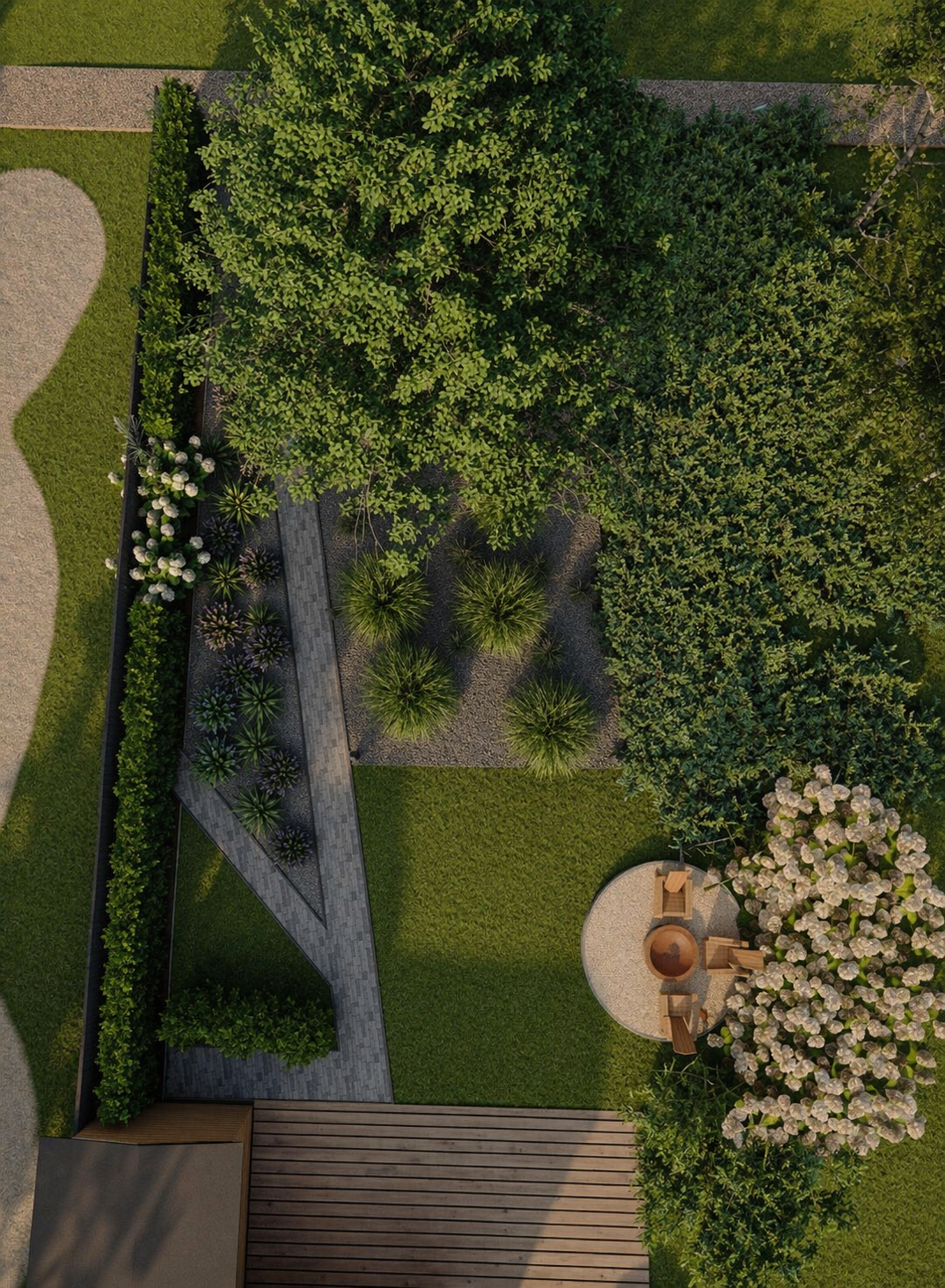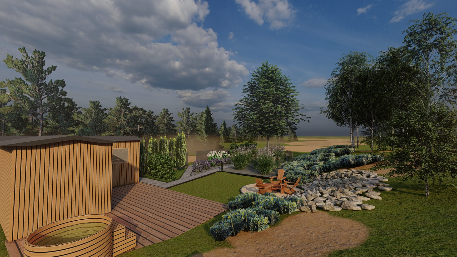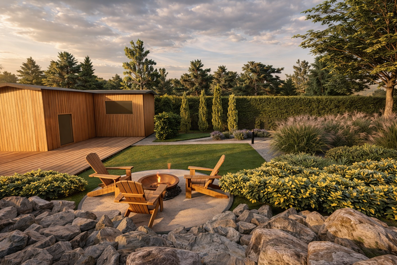 Sercem tej małopolskiej realizacji z 2025 roku jest luksusowa zewnętrzna sauna, wokół której harmonijnie wkomponowano elegancką strefę odpoczynku oraz nastrojowe palenisko. Zjawiskowa zieleń i starannie wytyczone ścieżki idealnie współgrają z naturalnym ukształtowaniem skarpy, oferując inwestorom ekskluzywną, przydomową przestrzeń do odnowy biologicznej na najwyższym poziomie.